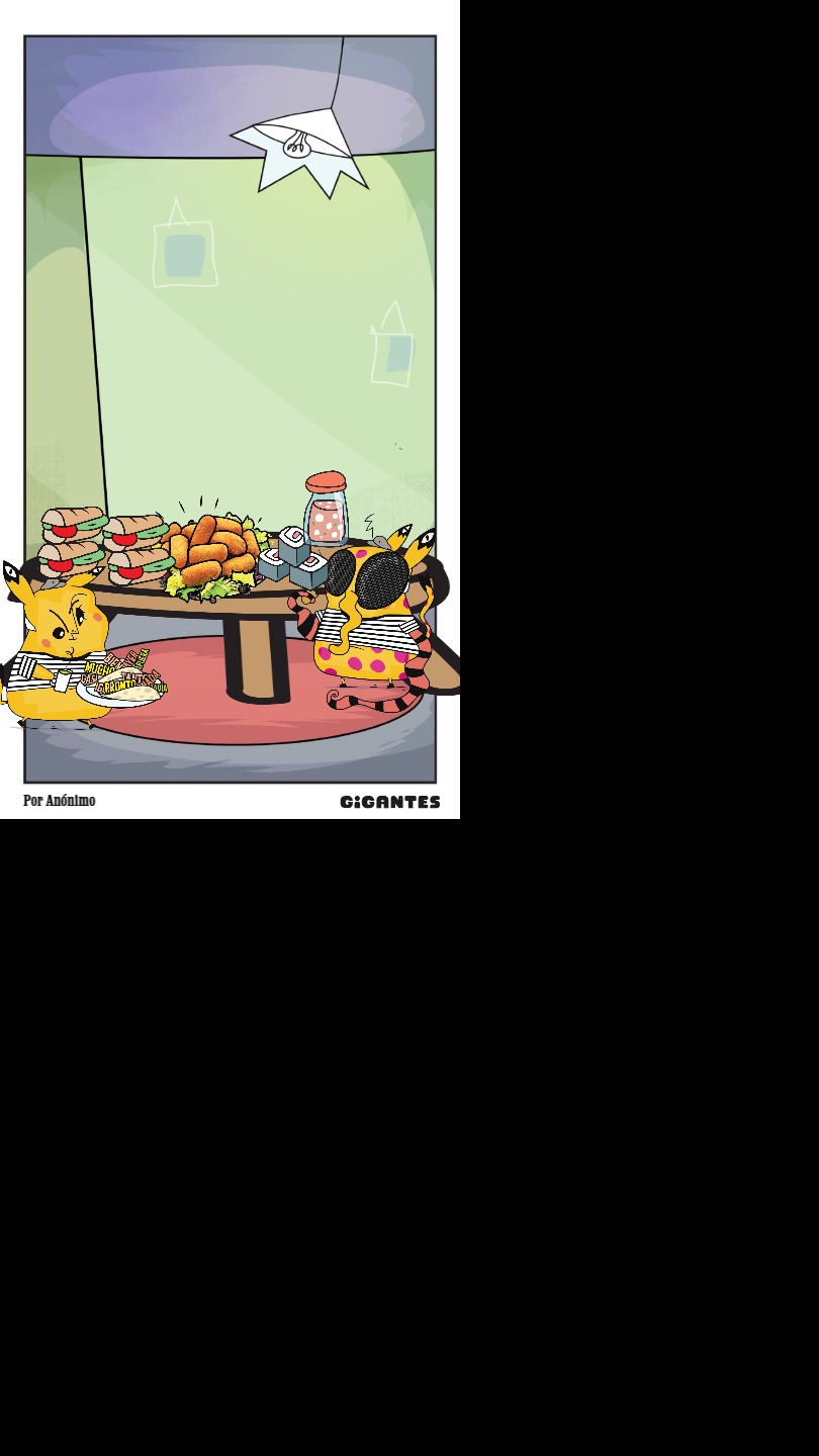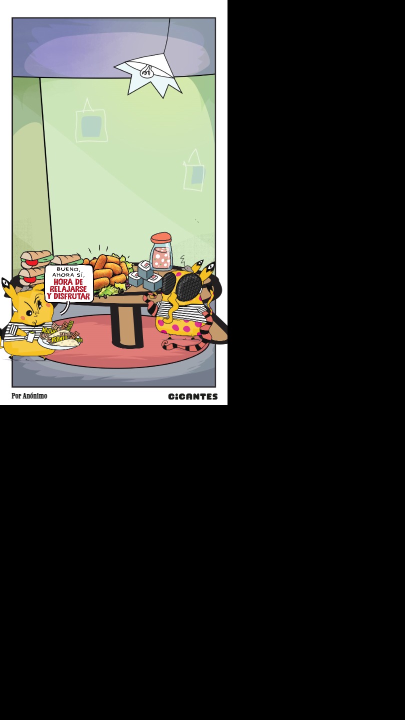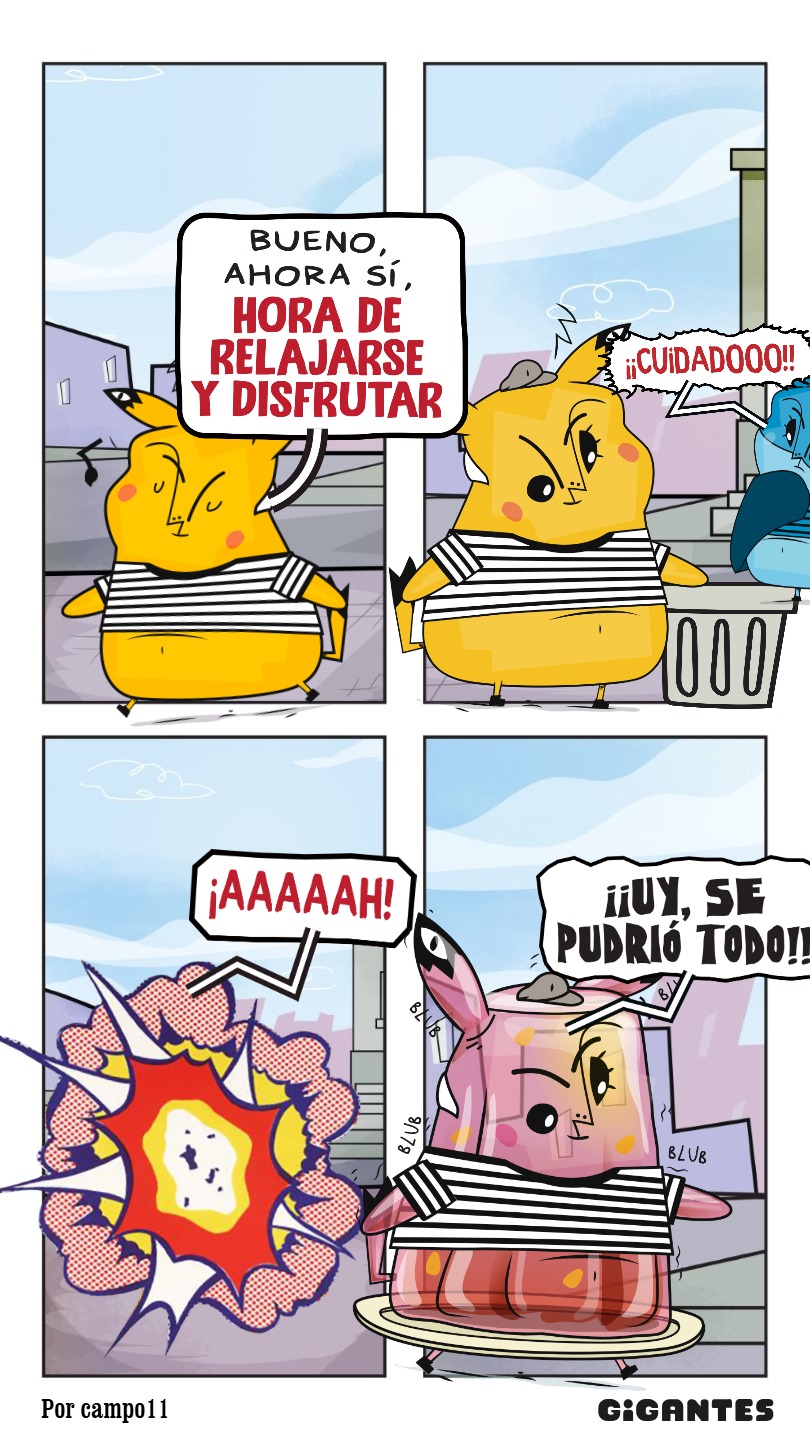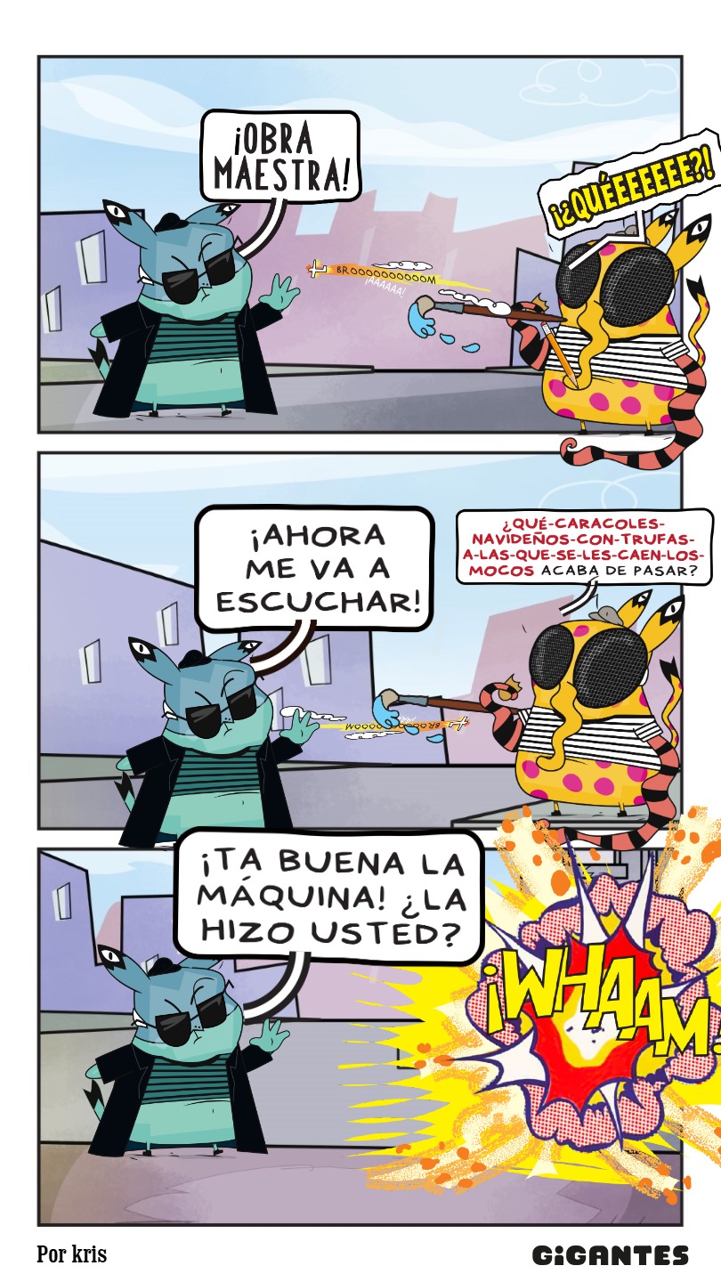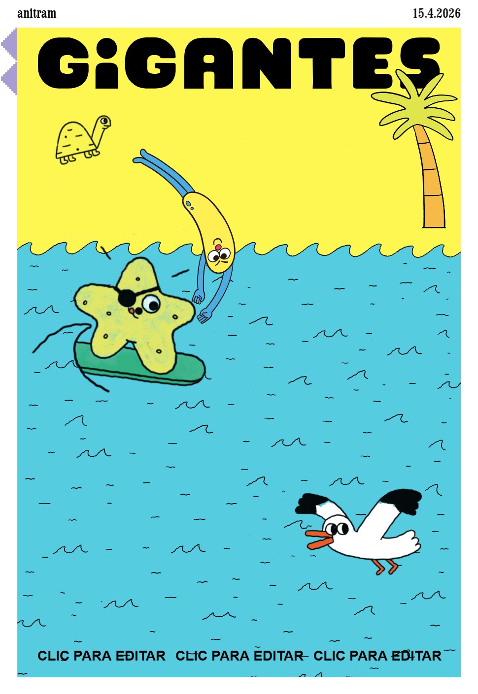 Llegaste a una ciudad con una actividad disparatada. Un dinosaurio y un inmenso gato surfean en la rambla. El superhéroe pasea en una nube y el sol tiene flotador. Niños y niñas juegan; pasean en auto, bicicleta, moto, patineta y silla de ruedas. Un mono corretea, una señora hace yoga. Un edificio antiguo con un cartel de Gigantes tiene 4 ventanales. ¡Cuidado! Dentro de ellas hay mucha acción. La ventana Arte tiene manos y pies, con pinceles y tijeras. En la Ventana Redacción hay una máquina de escribir y muchas manos sobre ella. En la Ventana Chatbot aparecen caritas con cuellos de serpientes. En la Ventana Picacho se asoma el personaje que es naranja y tiene orejas de conejo con ojos en la punta. Un tentáculo de pulpo sale de la pared.