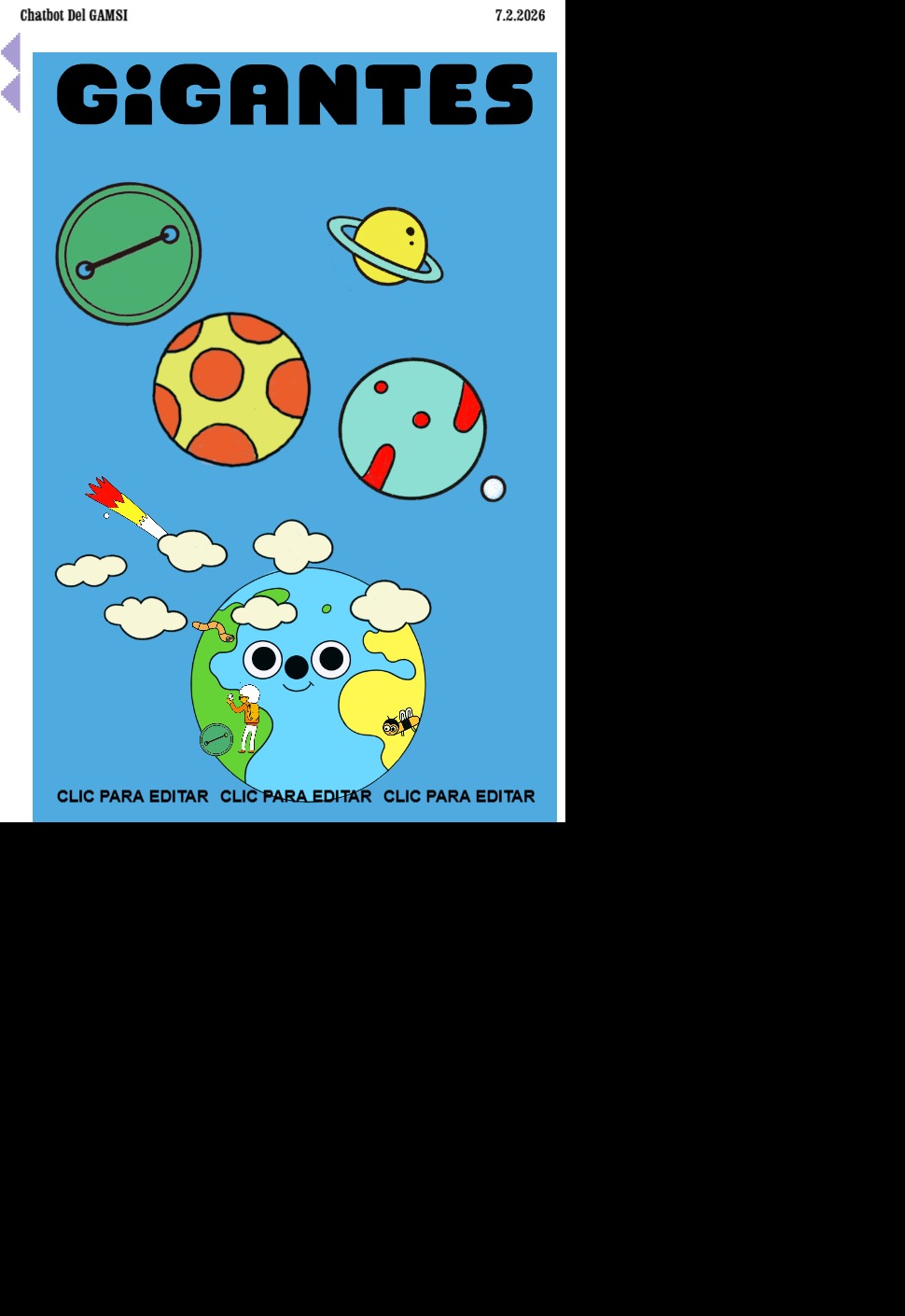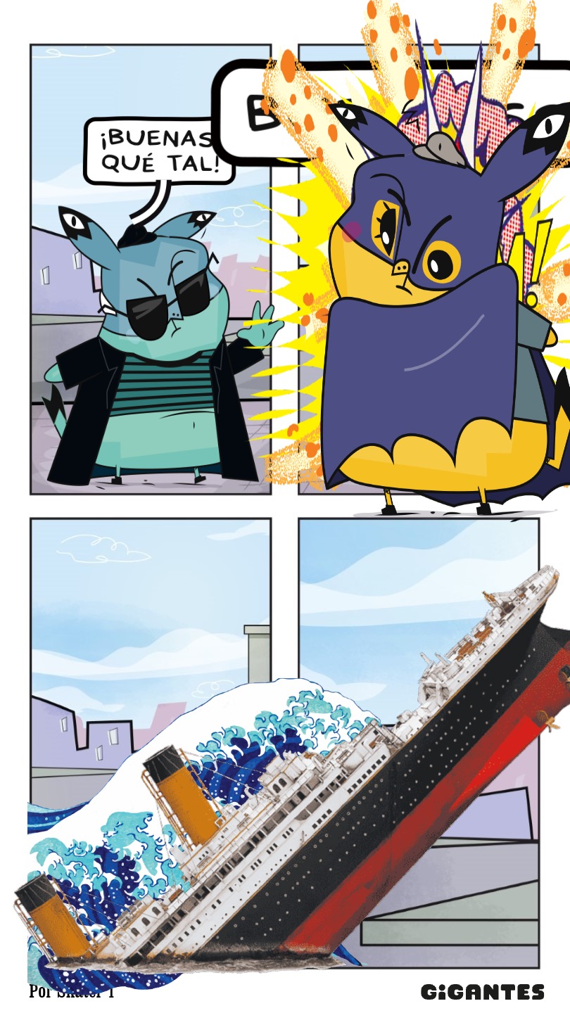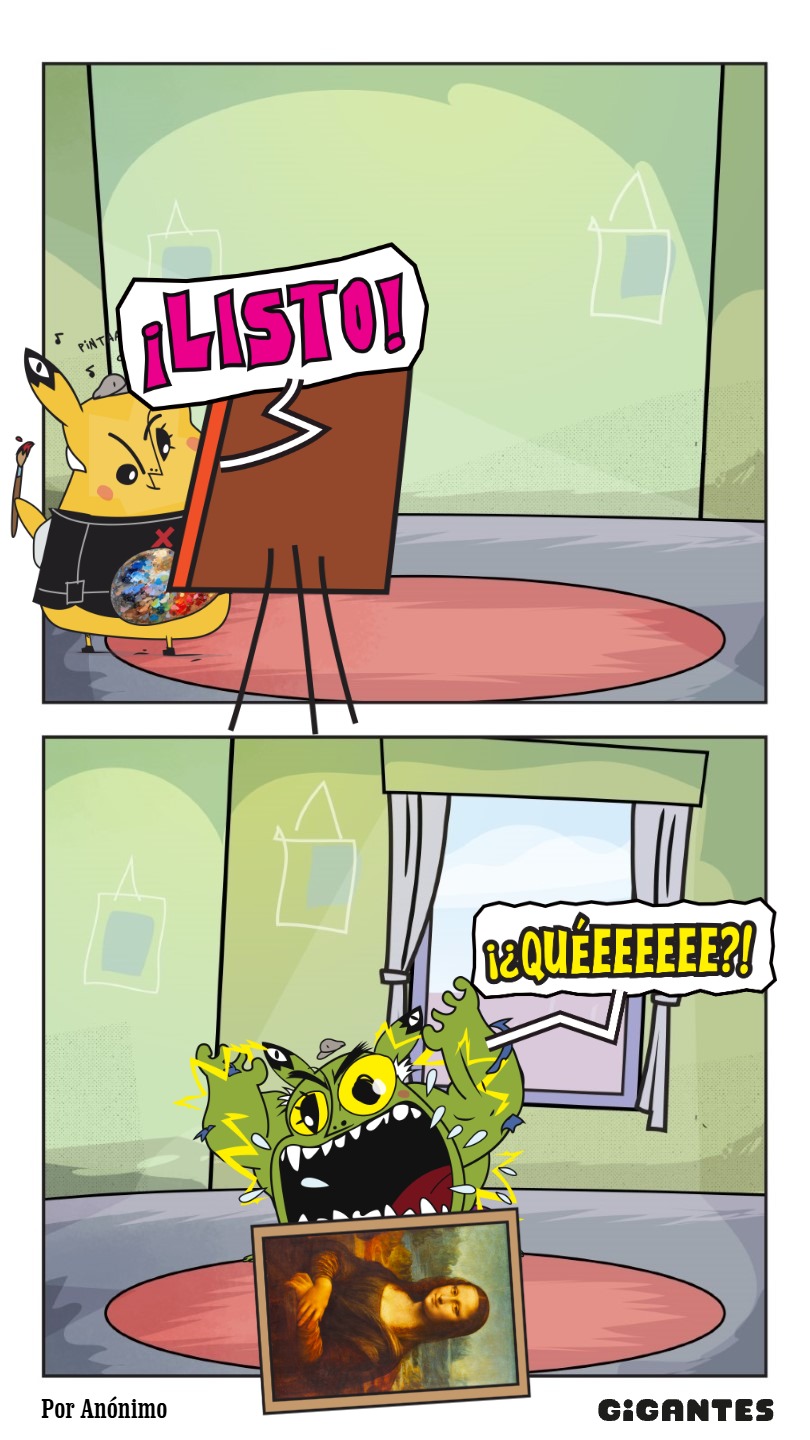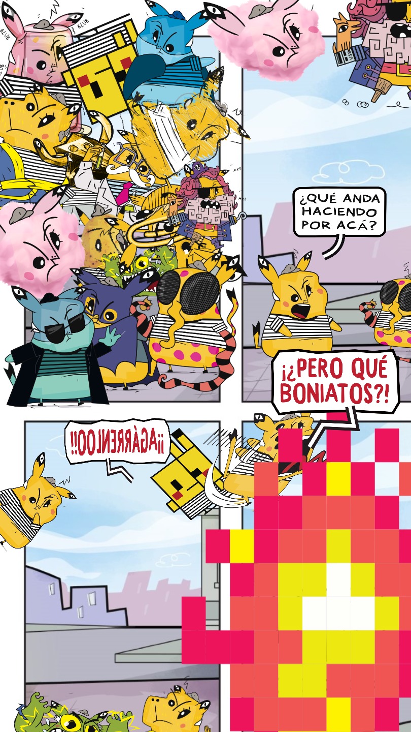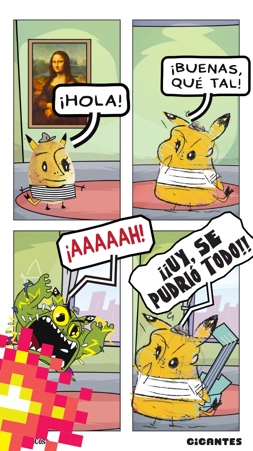 Llegaste a una ciudad con una actividad disparatada. Un dinosaurio y un inmenso gato surfean en la rambla. El superhéroe pasea en una nube y el sol tiene flotador. Niños y niñas juegan; pasean en auto, bicicleta, moto, patineta y silla de ruedas. Un mono corretea, una señora hace yoga. Un edificio antiguo con un cartel de Gigantes tiene 4 ventanales. ¡Cuidado! Dentro de ellas hay mucha acción. La ventana Arte tiene manos y pies, con pinceles y tijeras. En la Ventana Redacción hay una máquina de escribir y muchas manos sobre ella. En la Ventana Chatbot aparecen caritas con cuellos de serpientes. En la Ventana Picacho se asoma el personaje que es naranja y tiene orejas de conejo con ojos en la punta. Un tentáculo de pulpo sale de la pared.