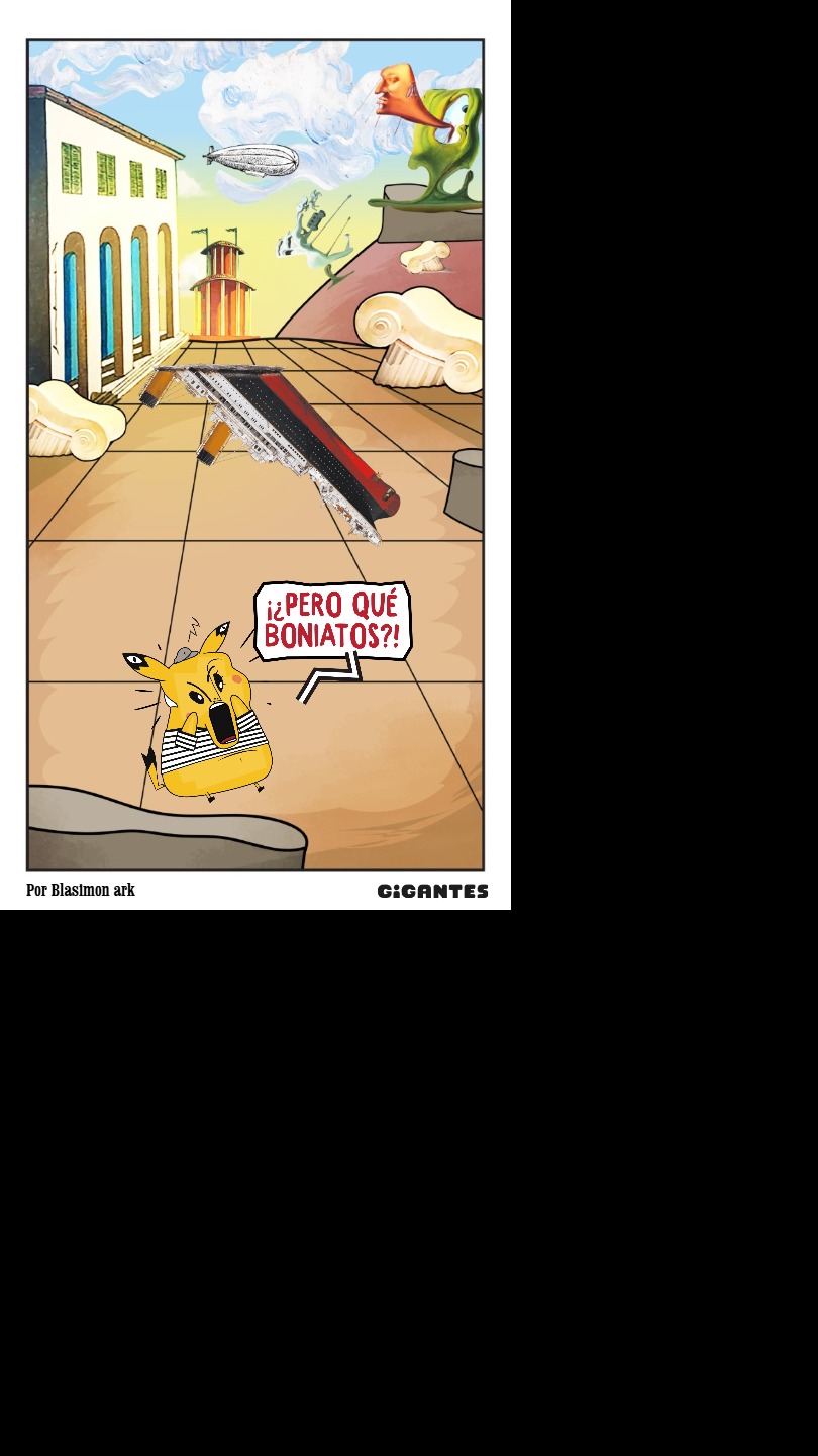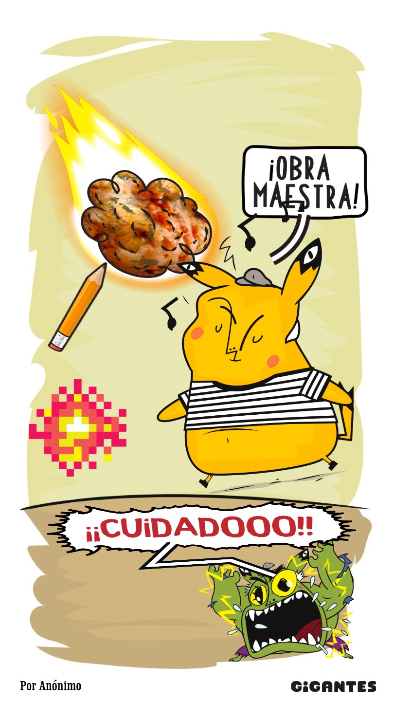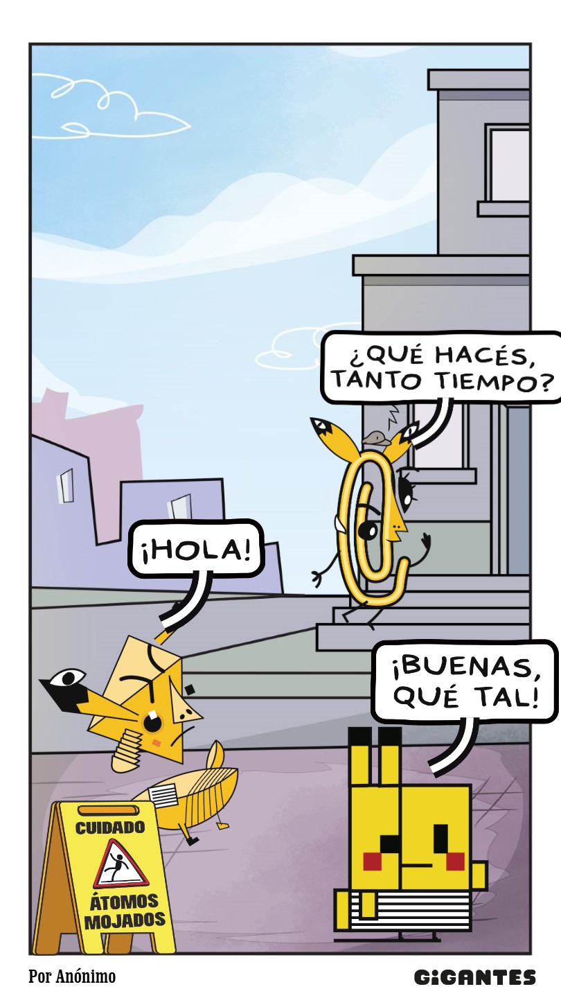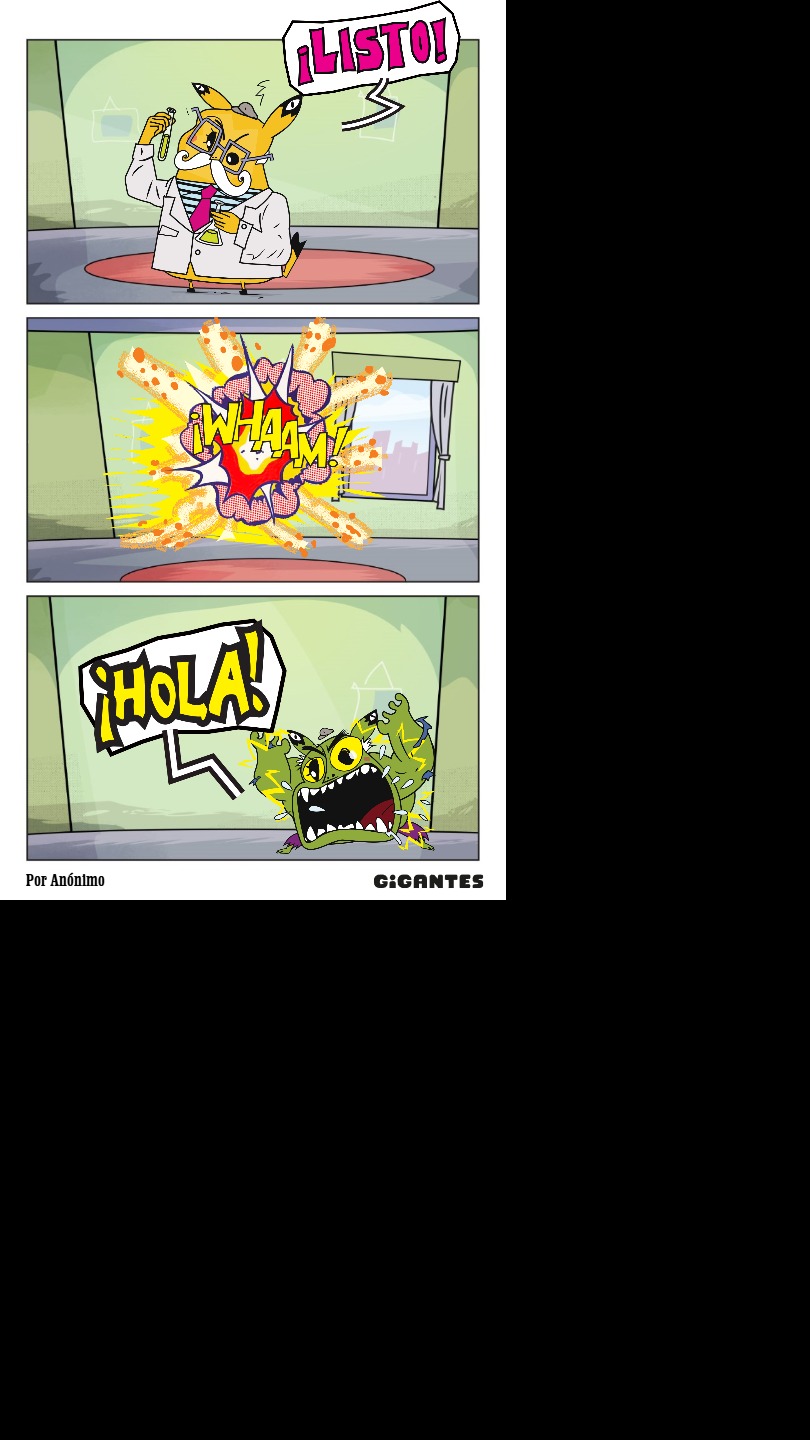 Llegaste a una ciudad con una actividad disparatada. Un dinosaurio y un inmenso gato surfean en la rambla. El superhéroe pasea en una nube y el sol tiene flotador. Niños y niñas juegan; pasean en auto, bicicleta, moto, patineta y silla de ruedas. Un mono corretea, una señora hace yoga. Un edificio antiguo con un cartel de Gigantes tiene 4 ventanales. ¡Cuidado! Dentro de ellas hay mucha acción. La ventana Arte tiene manos y pies, con pinceles y tijeras. En la Ventana Redacción hay una máquina de escribir y muchas manos sobre ella. En la Ventana Chatbot aparecen caritas con cuellos de serpientes. En la Ventana Picacho se asoma el personaje que es naranja y tiene orejas de conejo con ojos en la punta. Un tentáculo de pulpo sale de la pared.