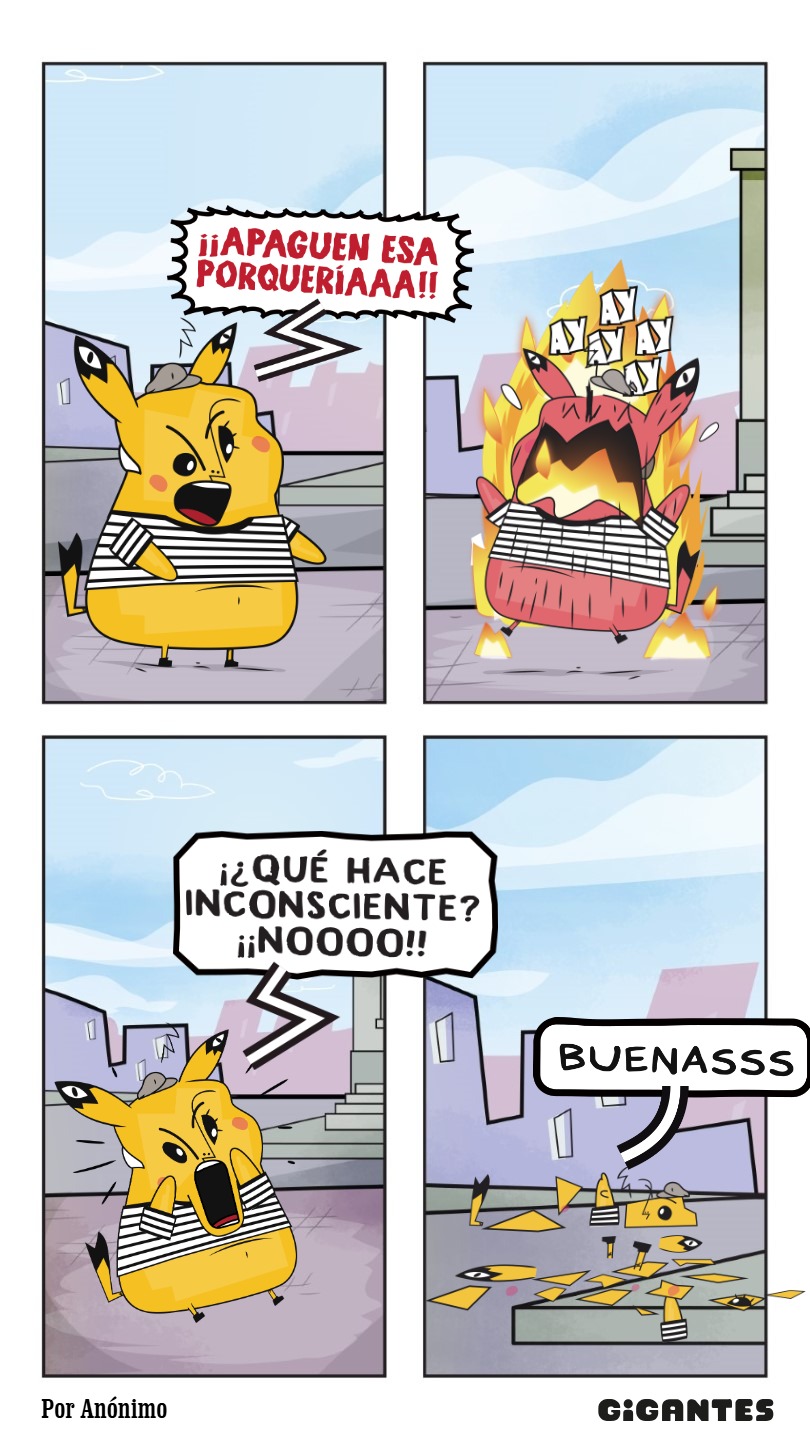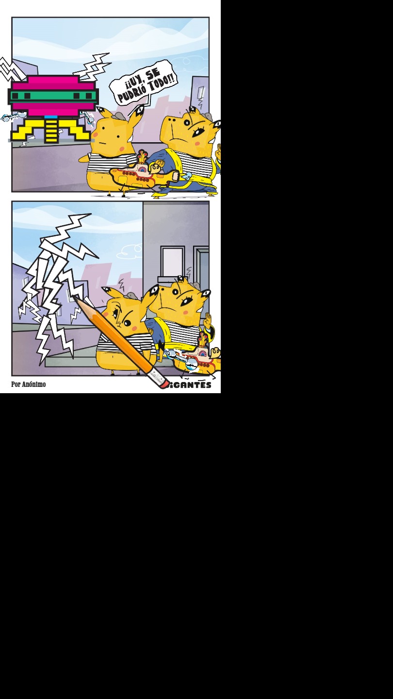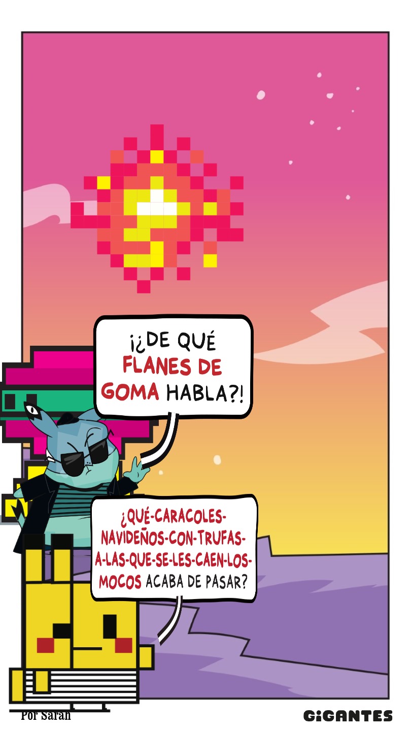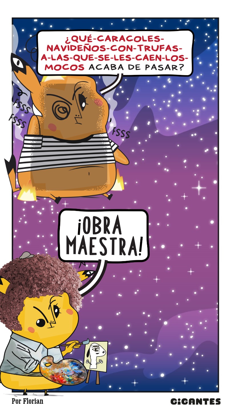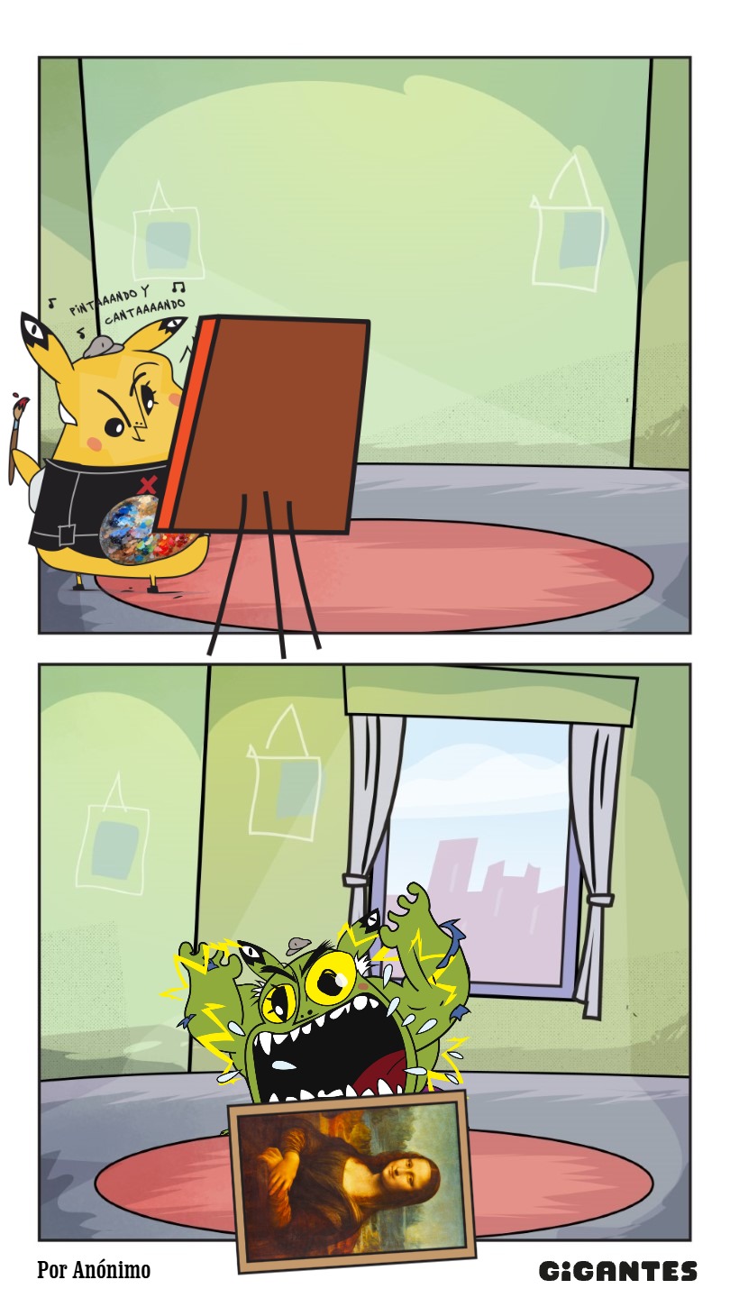 Llegaste a una ciudad con una actividad disparatada. Un dinosaurio y un inmenso gato surfean en la rambla. El superhéroe pasea en una nube y el sol tiene flotador. Niños y niñas juegan; pasean en auto, bicicleta, moto, patineta y silla de ruedas. Un mono corretea, una señora hace yoga. Un edificio antiguo con un cartel de Gigantes tiene 4 ventanales. ¡Cuidado! Dentro de ellas hay mucha acción. La ventana Arte tiene manos y pies, con pinceles y tijeras. En la Ventana Redacción hay una máquina de escribir y muchas manos sobre ella. En la Ventana Chatbot aparecen caritas con cuellos de serpientes. En la Ventana Picacho se asoma el personaje que es naranja y tiene orejas de conejo con ojos en la punta. Un tentáculo de pulpo sale de la pared.