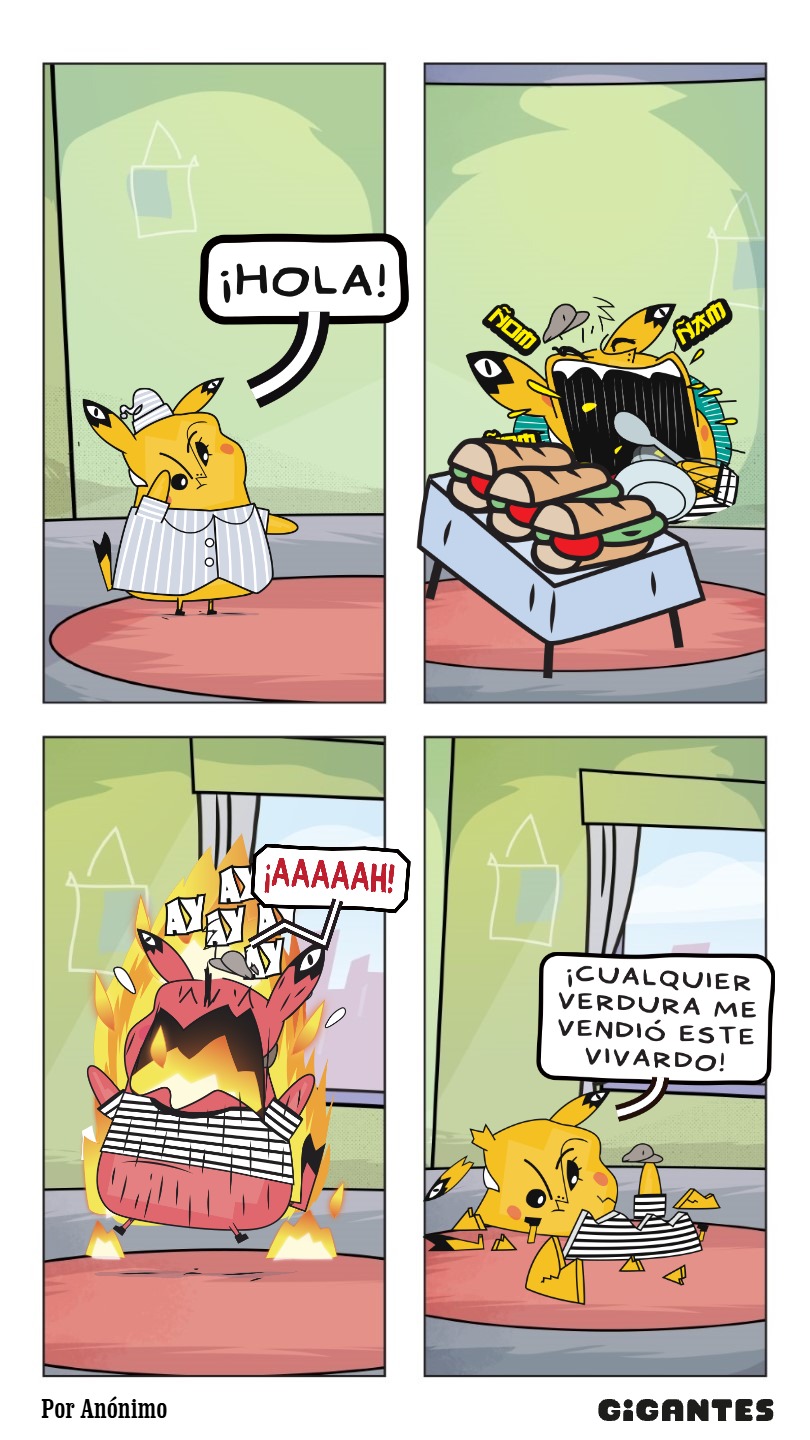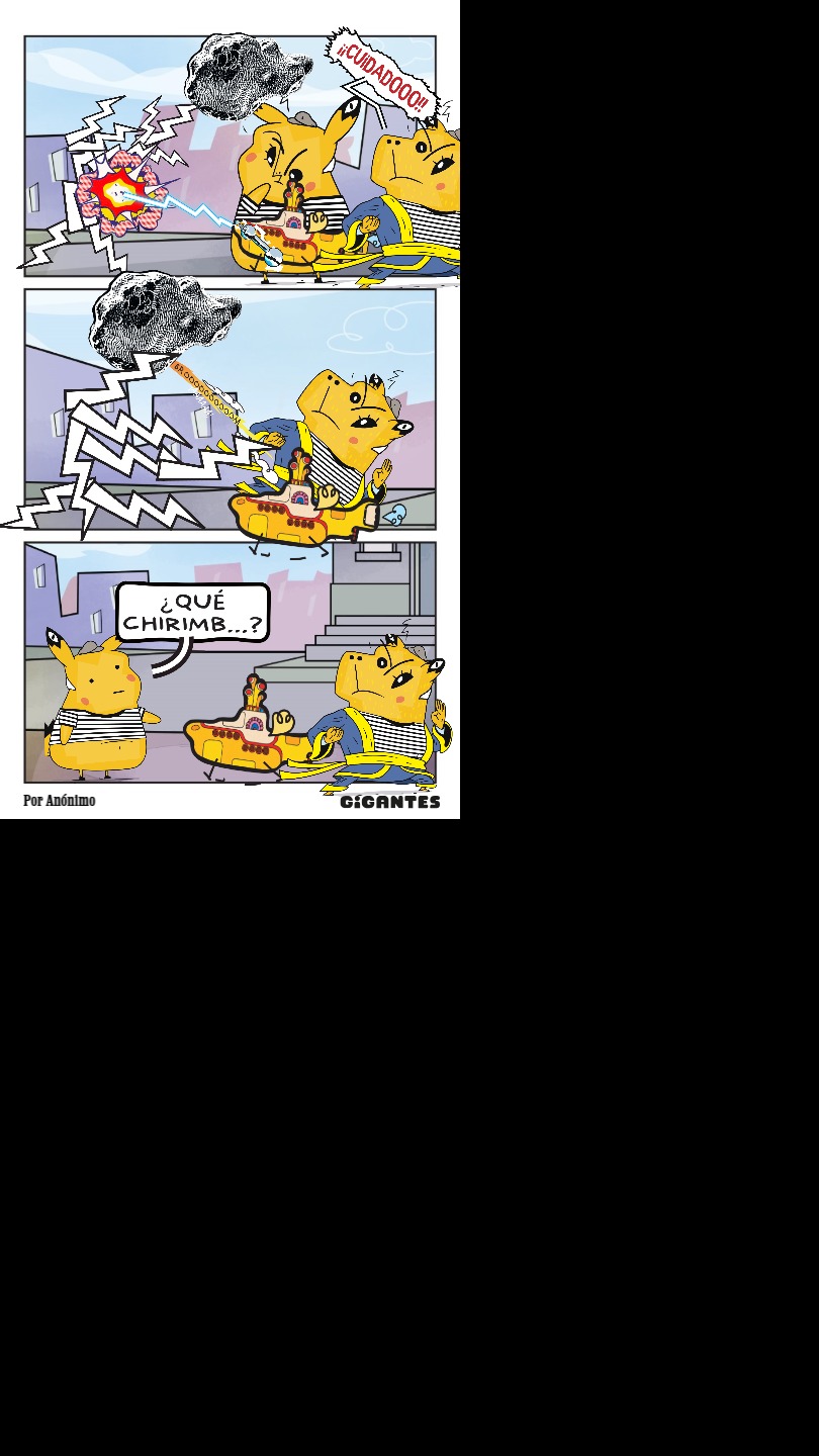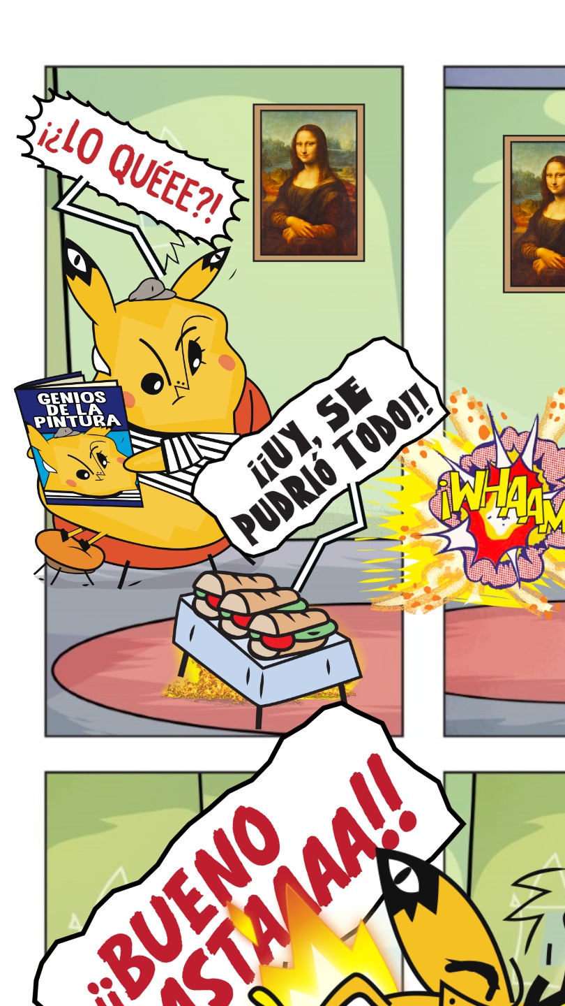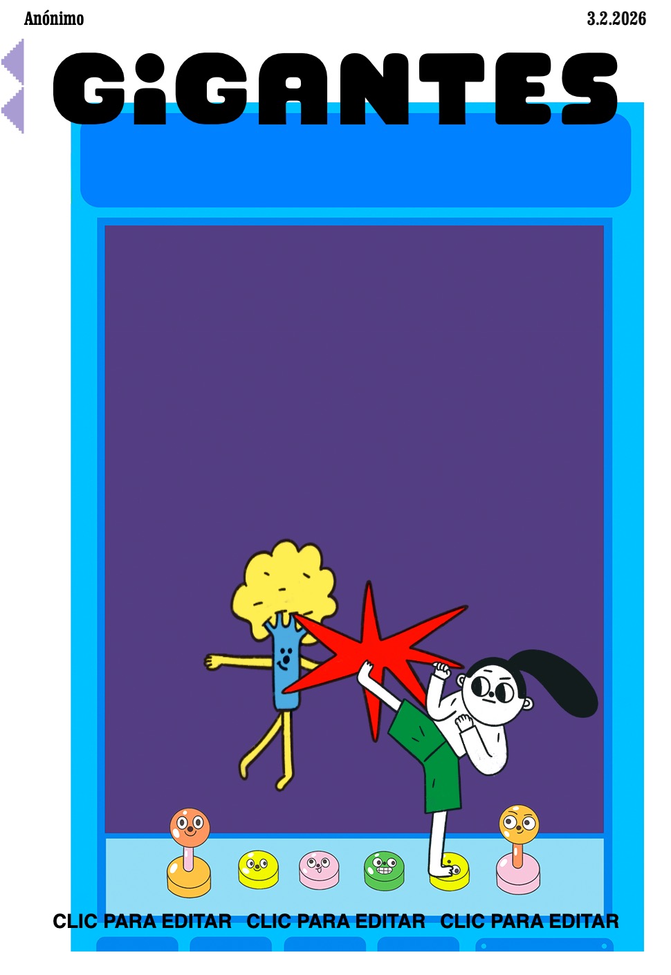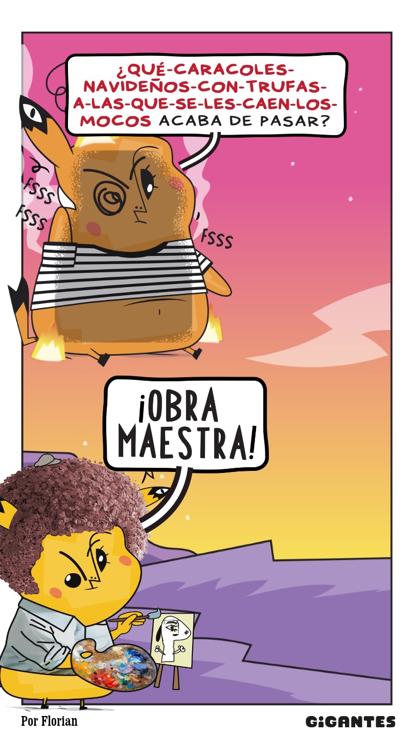 Llegaste a una ciudad con una actividad disparatada. Un dinosaurio y un inmenso gato surfean en la rambla. El superhéroe pasea en una nube y el sol tiene flotador. Niños y niñas juegan; pasean en auto, bicicleta, moto, patineta y silla de ruedas. Un mono corretea, una señora hace yoga. Un edificio antiguo con un cartel de Gigantes tiene 4 ventanales. ¡Cuidado! Dentro de ellas hay mucha acción. La ventana Arte tiene manos y pies, con pinceles y tijeras. En la Ventana Redacción hay una máquina de escribir y muchas manos sobre ella. En la Ventana Chatbot aparecen caritas con cuellos de serpientes. En la Ventana Picacho se asoma el personaje que es naranja y tiene orejas de conejo con ojos en la punta. Un tentáculo de pulpo sale de la pared.