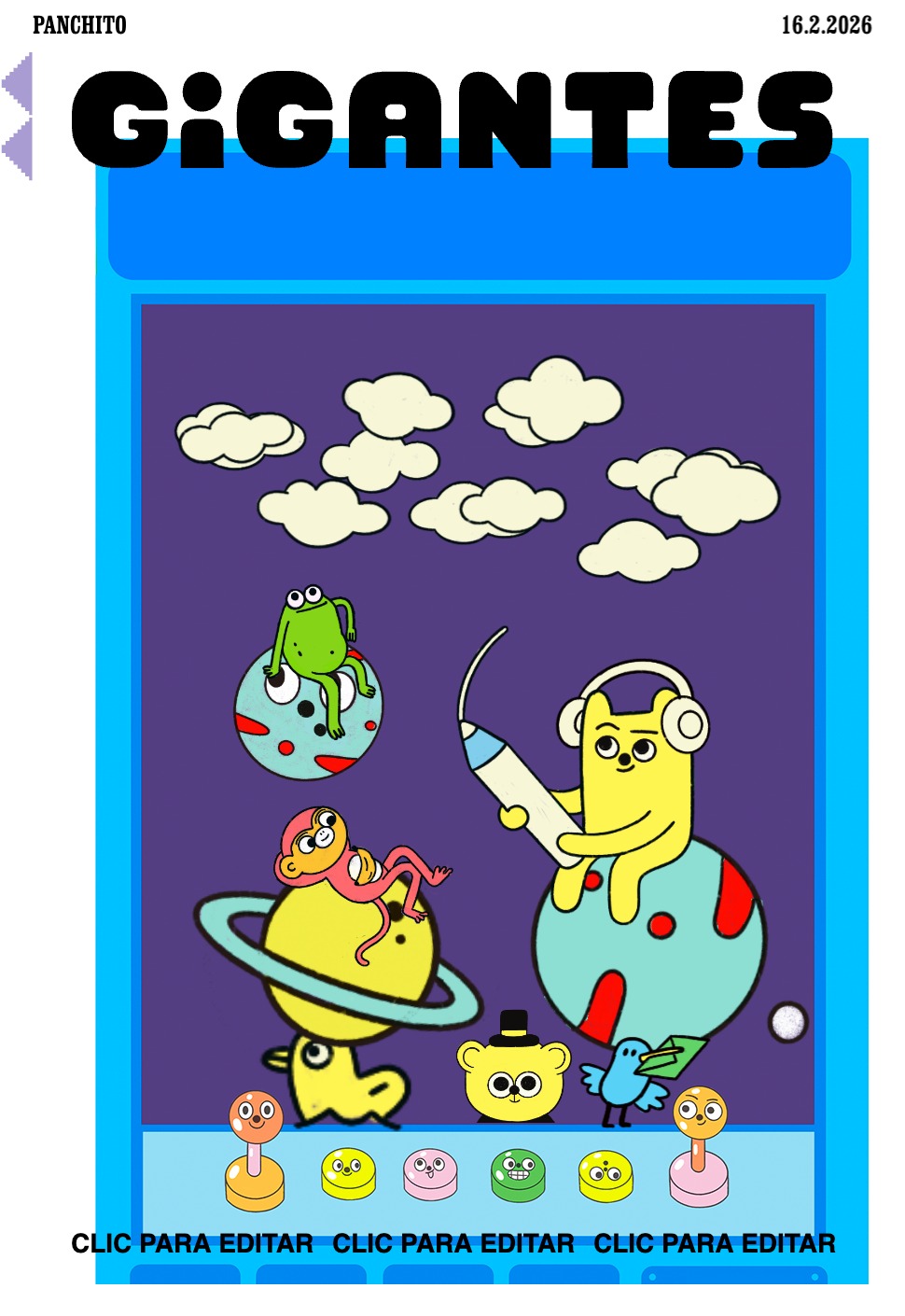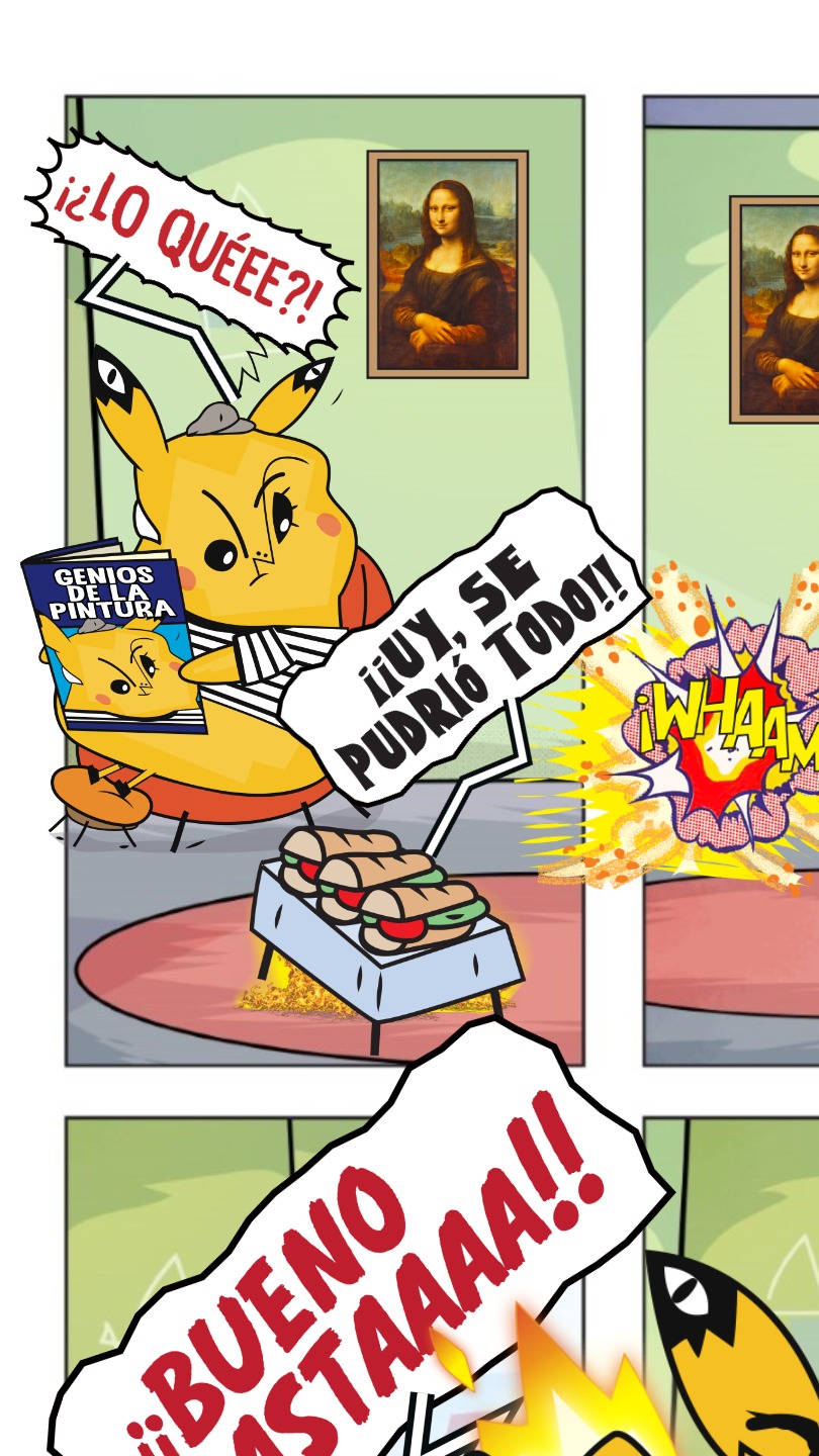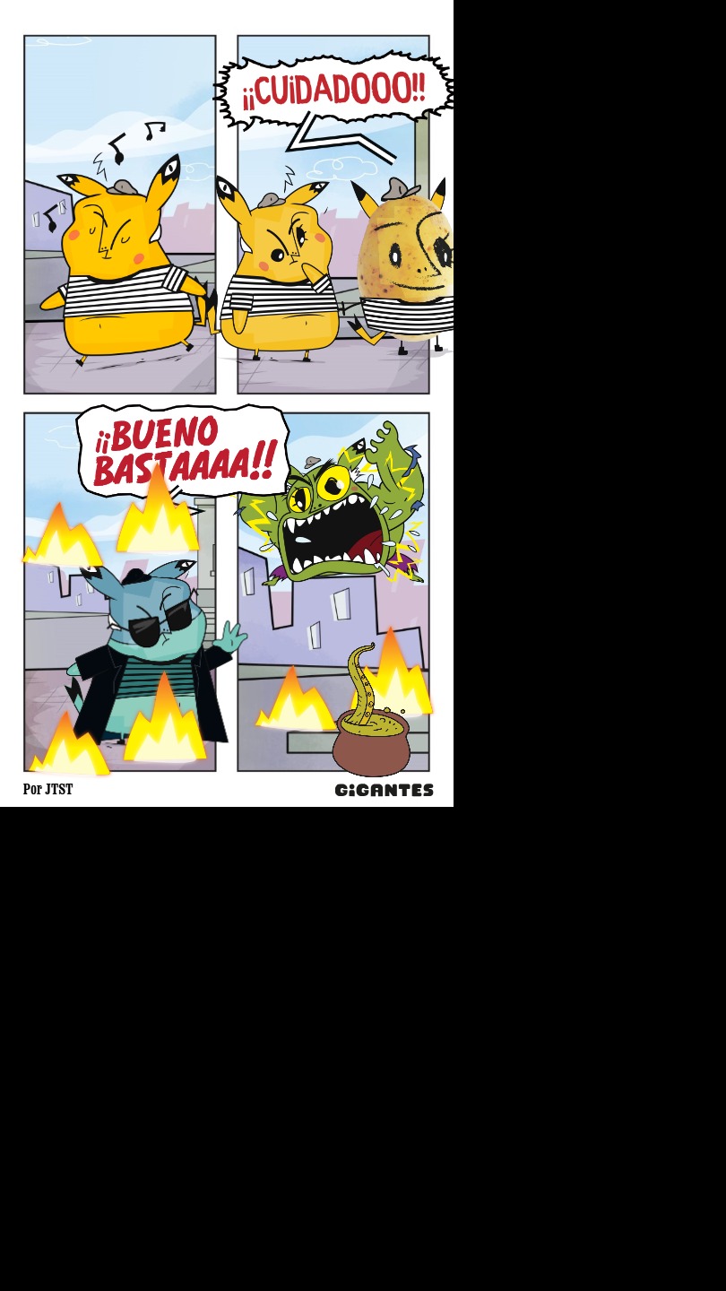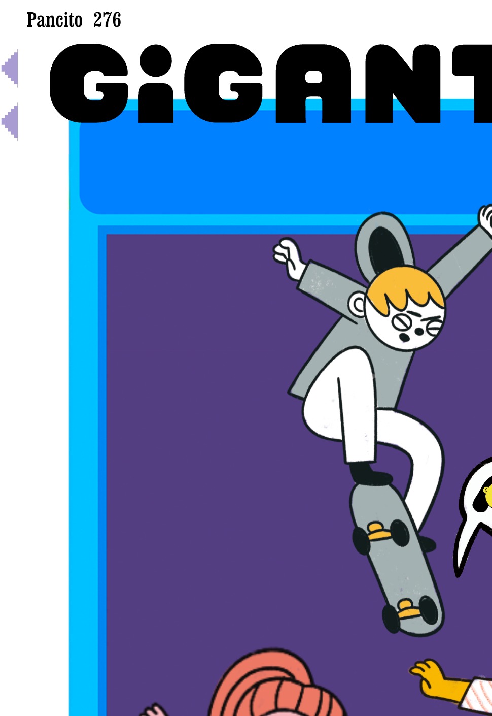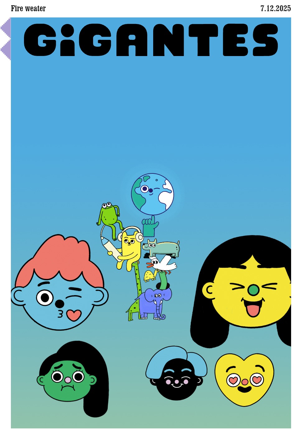 Llegaste a una ciudad con una actividad disparatada. Un dinosaurio y un inmenso gato surfean en la rambla. El superhéroe pasea en una nube y el sol tiene flotador. Niños y niñas juegan; pasean en auto, bicicleta, moto, patineta y silla de ruedas. Un mono corretea, una señora hace yoga. Un edificio antiguo con un cartel de Gigantes tiene 4 ventanales. ¡Cuidado! Dentro de ellas hay mucha acción. La ventana Arte tiene manos y pies, con pinceles y tijeras. En la Ventana Redacción hay una máquina de escribir y muchas manos sobre ella. En la Ventana Chatbot aparecen caritas con cuellos de serpientes. En la Ventana Picacho se asoma el personaje que es naranja y tiene orejas de conejo con ojos en la punta. Un tentáculo de pulpo sale de la pared.