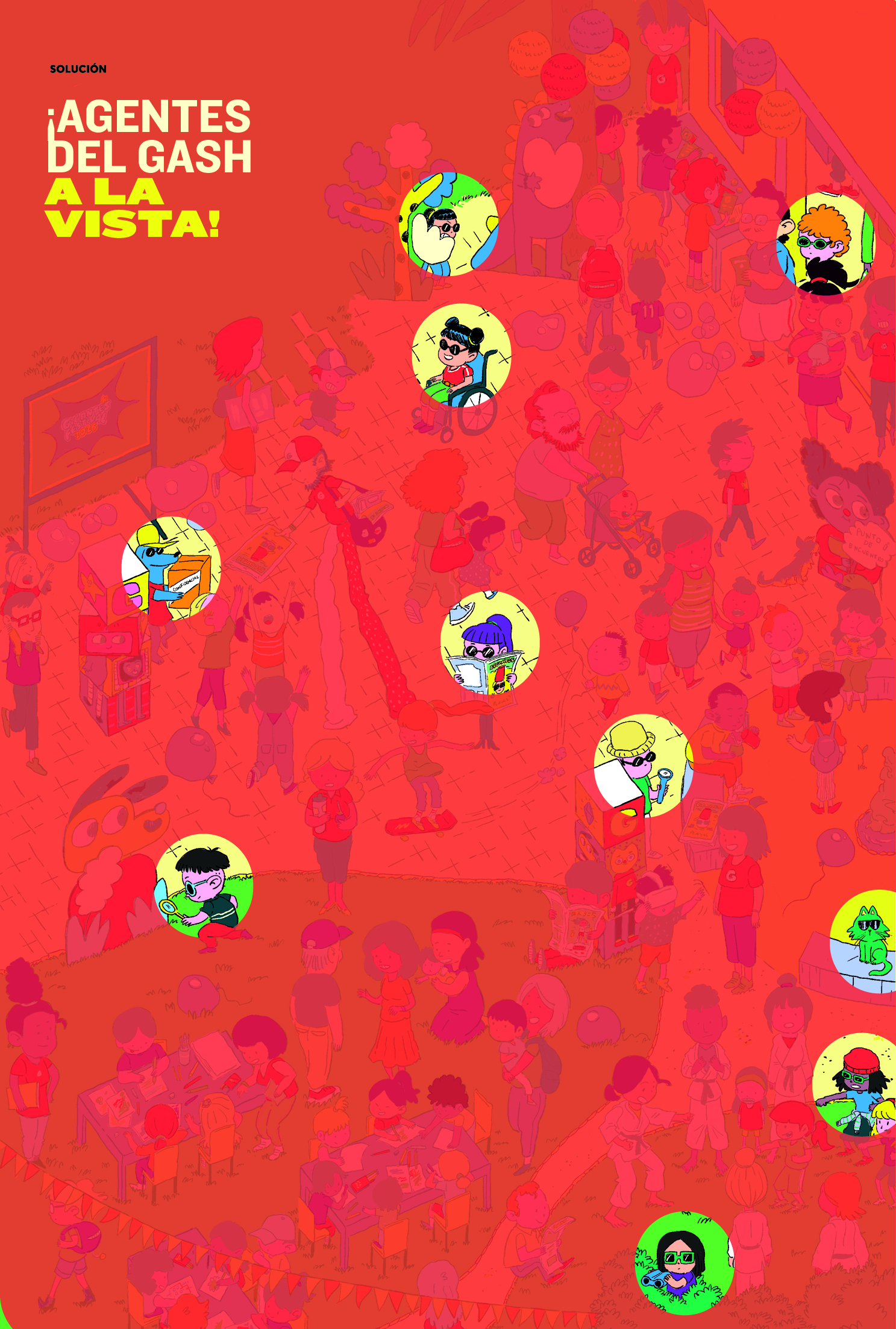 Diez agentes del GASH aparecen escondidos en esta ilustración del festival de Gigantes. ¡Lo que los delata son los lentes negros! Aquí está la solución.